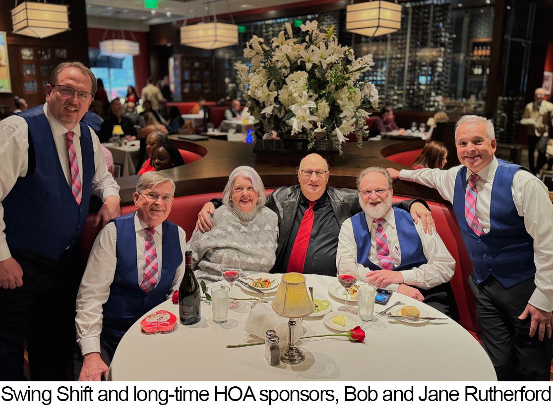 | By John Braden "Hanging Judge" the Hon. John Erwine returned to the Heart of America Chorus Installation and Awards Banquet, Jan. 6, 2024, checking up on his 2023 "sentencing" of the Big Schu Mob to a year of service as HOA Board members. What he found was a high rate of recidivism, installing 10 of the 14 2023 board members to another year's sentence and adding four new gang members to the board. ![]() Erwine stepped down from the bench to call the newly elected 2024 officers forward and task them with their specific responsibilities, noting "everything else is details." Fifty Kansas City Chapter members and family met at Joe's KC Barbecue's 180 Room in Olathe for installation of officers, annual awards and a bit of singing. Board members inaugurated were: President Mike Schumacher Immediate Past President Charles Ramirez Secretary Tom Hadley Treasurer Harvey Shapiro Executive VP Danny Anderson Public Relations VP Chris Walker Chapter Development VP Don Fuson Music & Performance VP John Braden Operations VP Steve Keisker Program VP Jerry Meier Members at Large Tony O'Brien, Vince Perry IV, Kerry Rawlins, Marlin Weidler. Big thank yous went to departing Executive VP Rick Foreman, Marketing VP Ted Simon, Music VP Bob Velazquez and Member at Large Tom Riedel. And another thank you to Program VP and the evening's master of ceremonies, Jerry Meier, for securing the venue and its great barbecue buffet. Returning President Mike Schumacher said he wants to find new opportunities for the chorus to reach out to our communities so other men can experience our joy of singing for others. He urged chapter members to step up when asked for help by board members because the chapter belongs to all members. HOA Director Carter Combs thanked the spouses and significant others in the audience for letting our boys come out and play. He gave a quick rundown of the history of music/performance delivery technology. It seems our competition started with Thomas Edison in 1877 and culminated (so far) with 3G phones that let people hear and see performances any time without having to hear and see live performers. He said, because the public has infinite entertainment options in their pockets, our options are: 1. Figure out how to entice them to come to us or 2. Take our art to them. John Braden acknowledged the passing of the five HOA members who joined the "Chapter Eternal" in 2023: Jordan Weber, Larry Poisner, Wendell Shaffer, Ron Abel and Jack Bussell. Barry Sanders was named the 2023 Barbershopper of the Year. Barry is a 35-year chapter member, sometimes quartetter, former HOA president, bass in New Harmony Handful, an organizer of Singing Valentines, HOA's Holiday Harmony Spectacular chairman for several years, and, as John Braden put it, "a relentlessly positive presence in our chapter."KC Common, with baritone Rick Foreman standing in for Paul Camarata, kicked off the singing. With tenor Marlin Weidler, lead Danny Anderson and bass Steve Keisker, KC Common sang "Let It Snow" and "Lullaby in Ragtime." Bringing up the rear was Swing Shift, with tenor Carter Combs, lead John Braden, baritone Charlie Hill and bass Eric Weber singing "Count Your Blessings" and "Walkin' My Baby Back Home." ![]() Photos by Don Fuson, Elizabeth Braden, Martin Oldehoeft. |