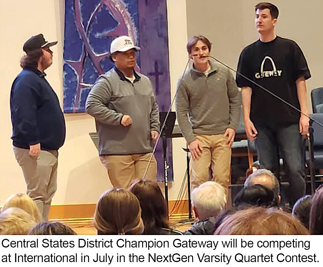 Special Thanks!! to the members of our Central States District Quartet Champion, Gateway quartet: Rob Abbott, Stephen Reynolds, Cole Williamson and Johnny Padigos, for entertaining the audience all day. We wish them Good Luck as they prepare to compete this summer in the BHS NextGen Varsity Quartet Competition.